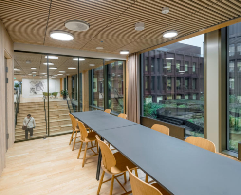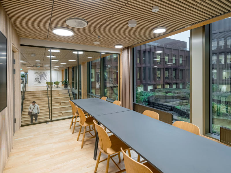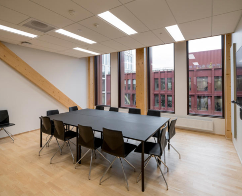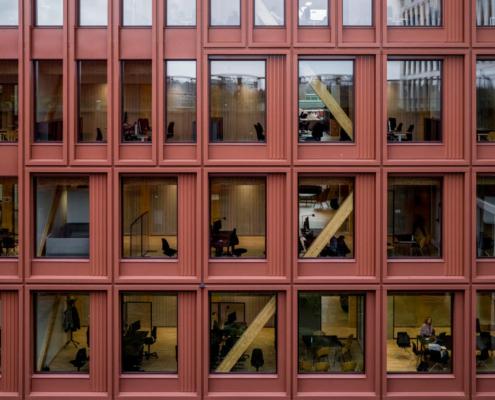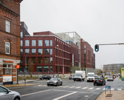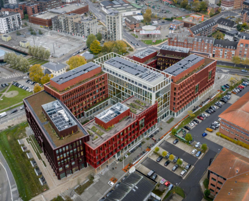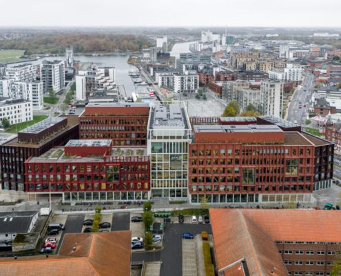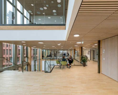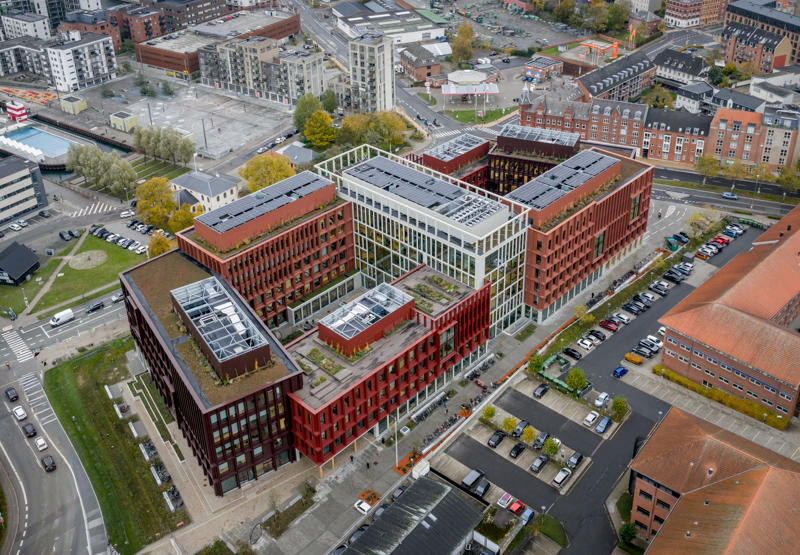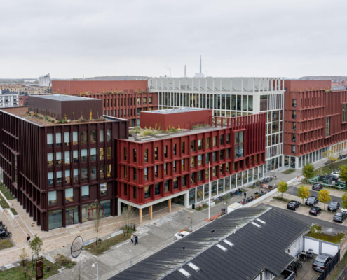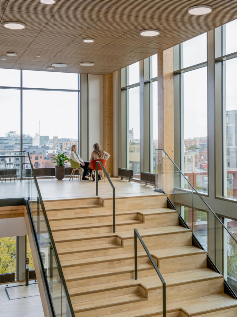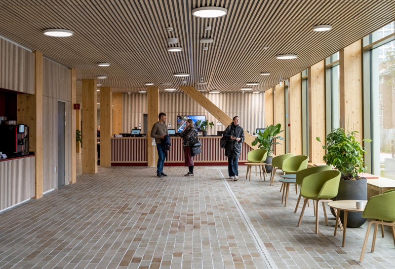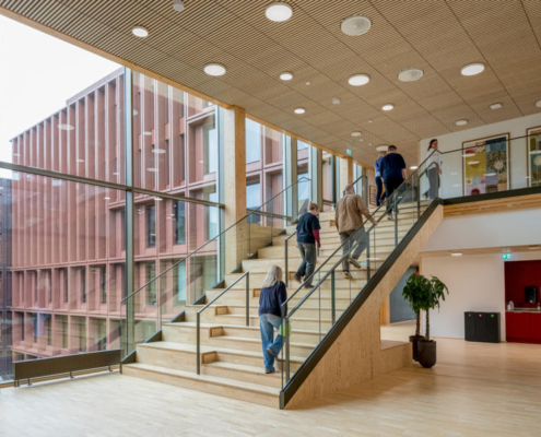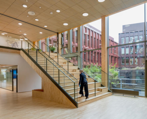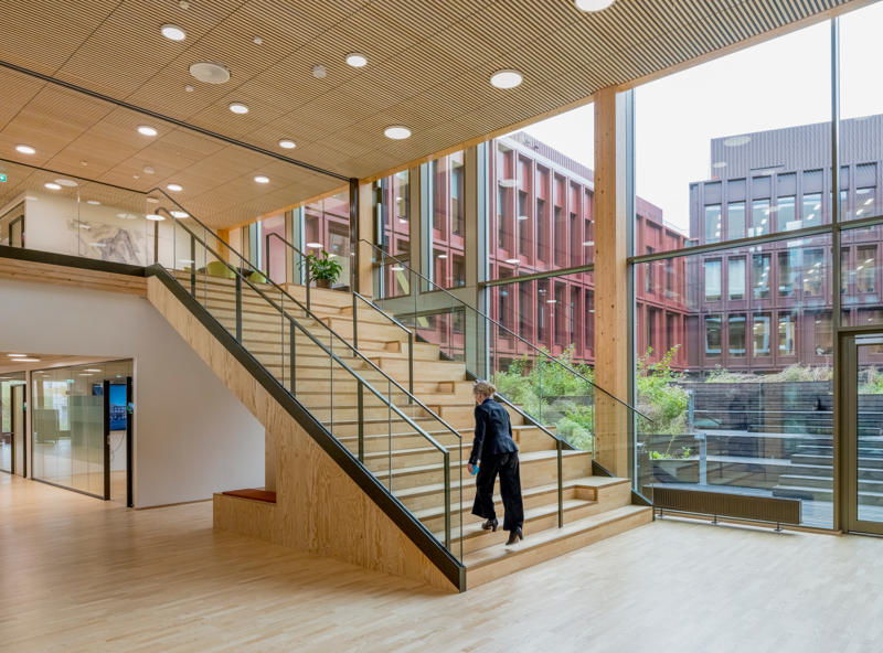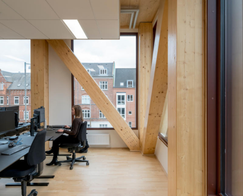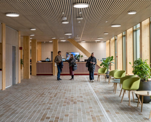 Odense kent merkezinde birden fazla kamu kurumunu tek çatı altında toplayan yeni ofis yapısı WoodHub, büyük ölçekli ahşap yapılaşma alanında öncü bir proje olmasının yanı sıra Danimarka’daki en büyük ahşap ofis binası olma özelliğini taşıyor. Yapı, iklim sorumluluğu gözetilerek tasarlanmış modern ve esnek bir çok kullanıcılı ofis ortamında toplam 1.600 kamu çalışanına ev sahipliği yapıyor. 31.000 metrekarelik masif ahşap taşıyıcı sistemi sayesinde proje, geleneksel bir yapı tipolojisine kıyasla yaşam döngüsü boyunca yaklaşık 5.400 ton daha az CO₂ salımı gerçekleştiriyor. Bu özelliğiyle WoodHub, belgelenmiş düşük karbon performansına sahip kamusal mimarlık alanında ulusal ölçekte bir referans yapıya dönüşüyor.