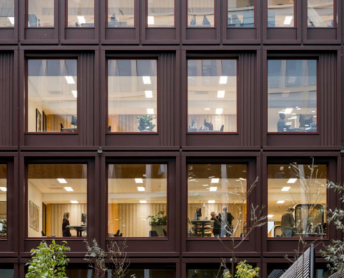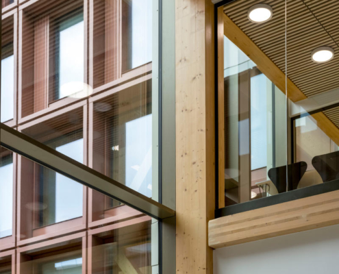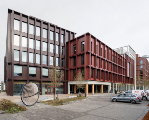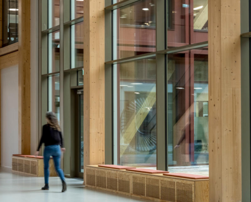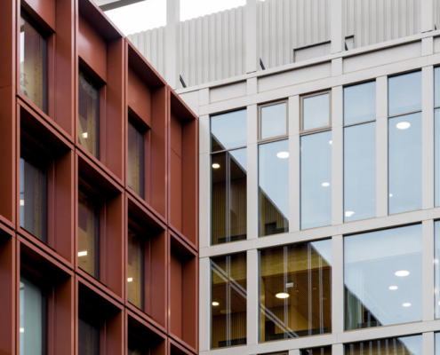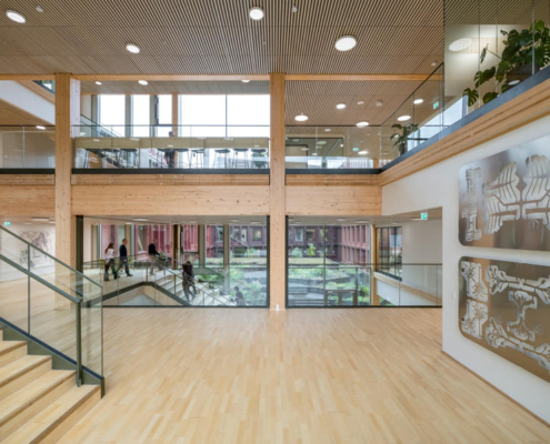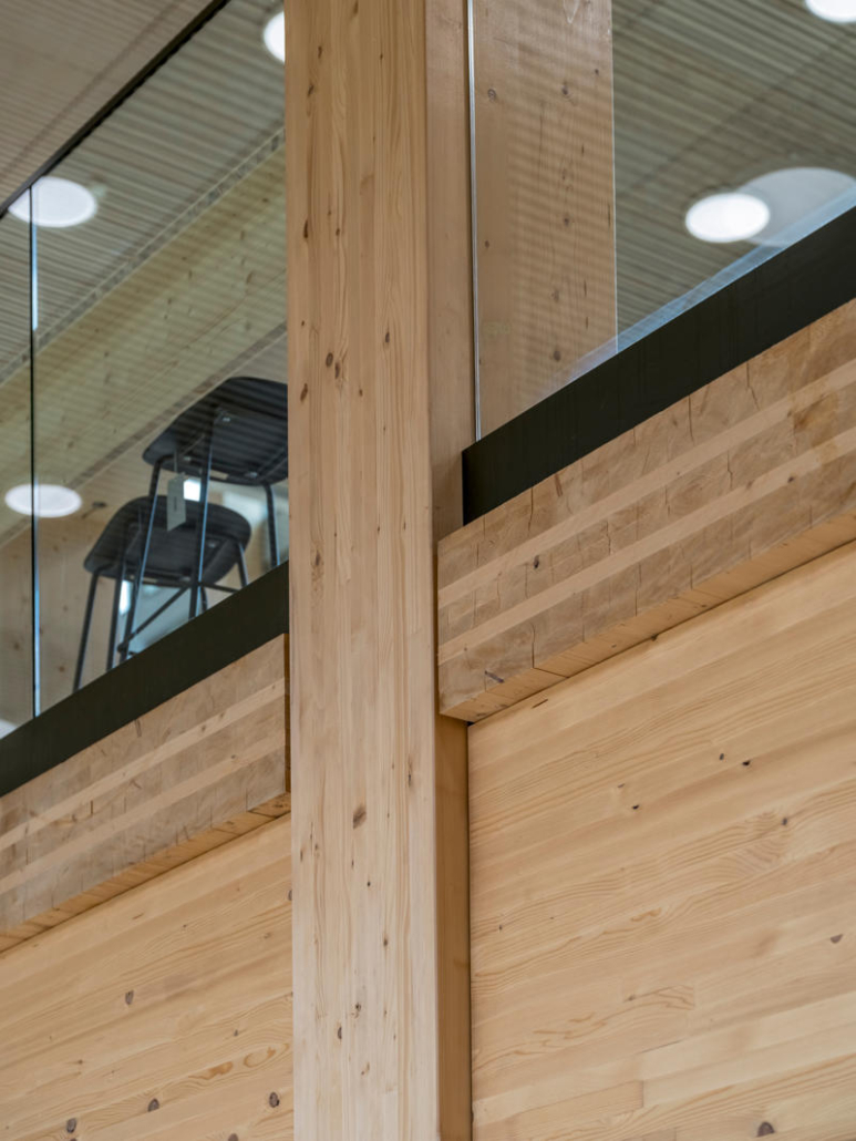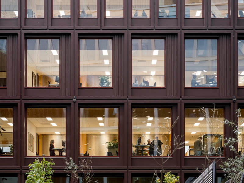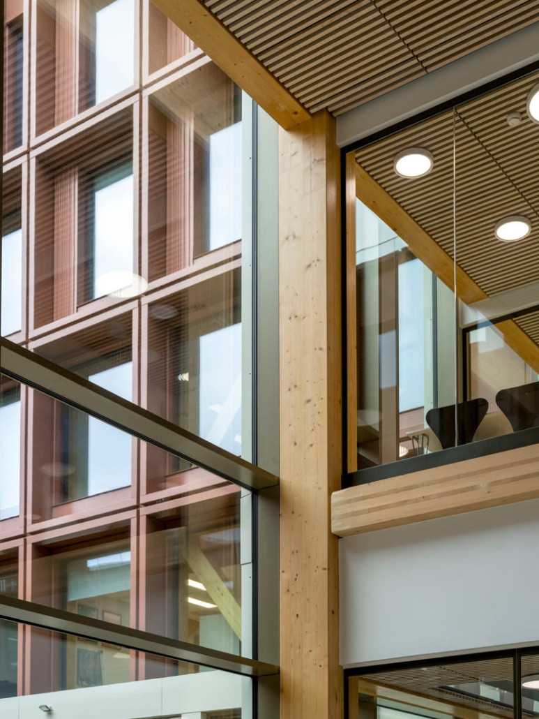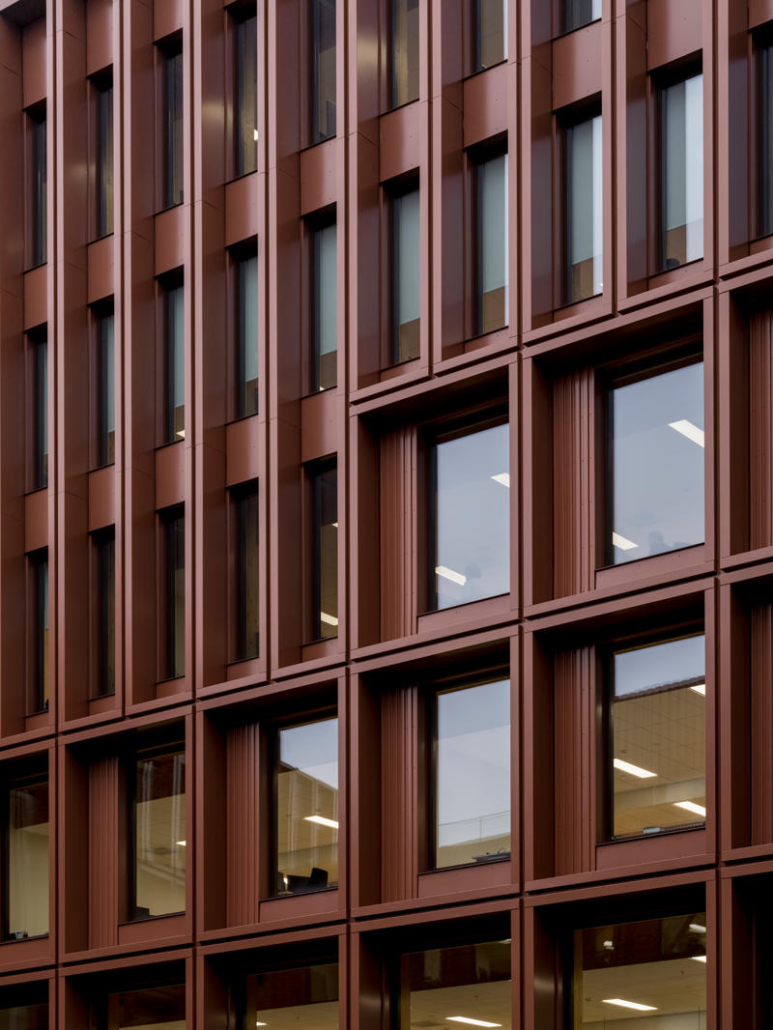 Görünür lamine ahşap kolonlar ve kısmen açıkta bırakılan çapraz lamine ahşap (CLT) döşemeler, yapının ana taşıyıcı elemanlarını oluşturuyor. Bu strüktürel sistem hem yüksek teknik performans sağlıyor hem de mekanda duyusal bir kalite yaratırken karbon depolama işlevi üstleniyor. Cepheler, çevredeki tuğla yapılarla uyum kuran kırmızı-kahverengi tonlarda geri dönüştürülmüş alüminyum panellerle kaplanmış. Cephe derinlikleri güneş hareketine göre çeşitlendirilerek pasif gölgeleme sağlanmış; bu sayede mekanik güneş kırıcı sistemlere ihtiyaç duyulmadan gün ışığından maksimum düzeyde yararlanılmış ve konforlu bir iç mekan iklimi elde edilmiş.