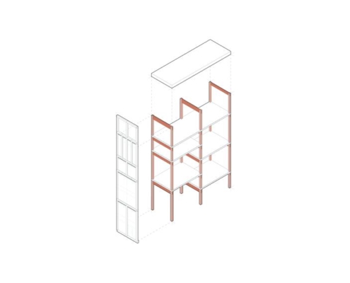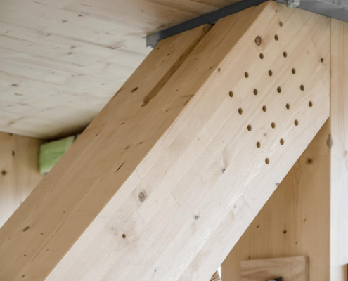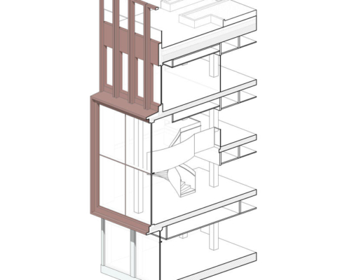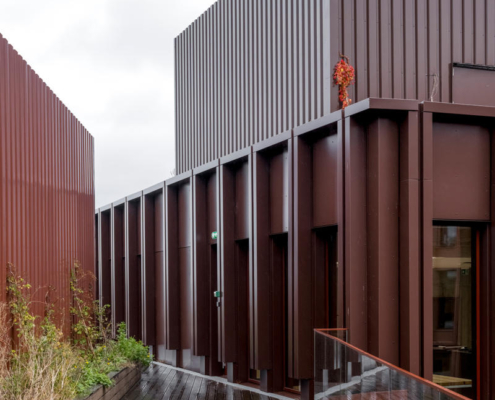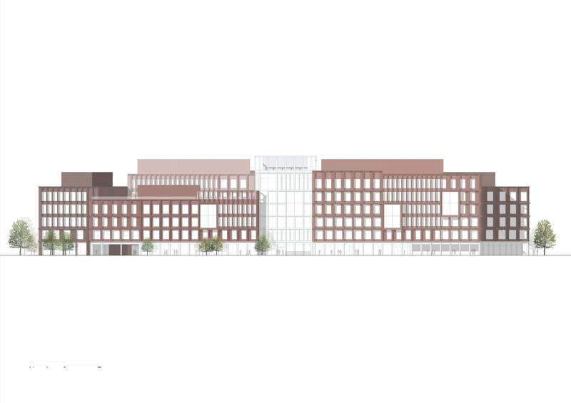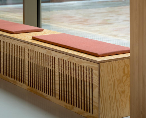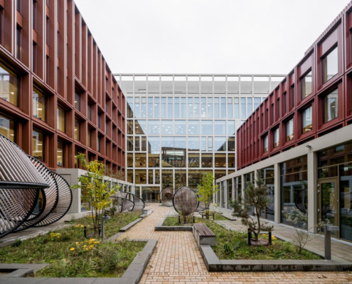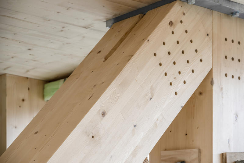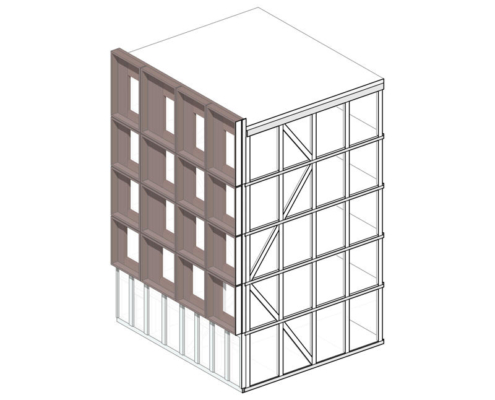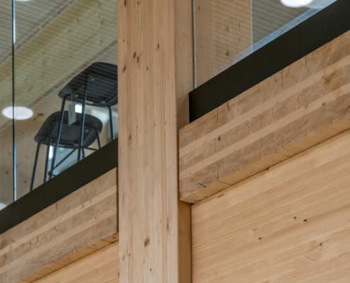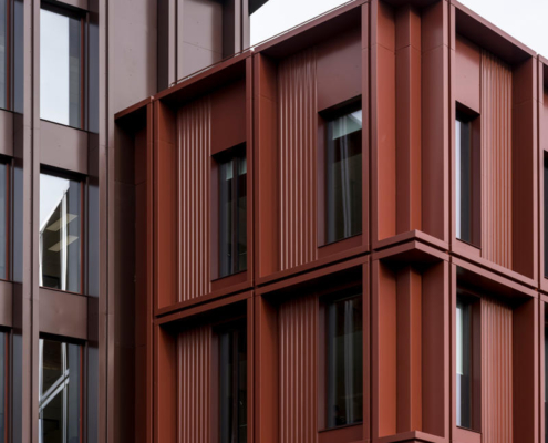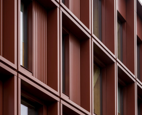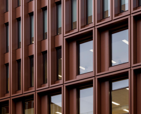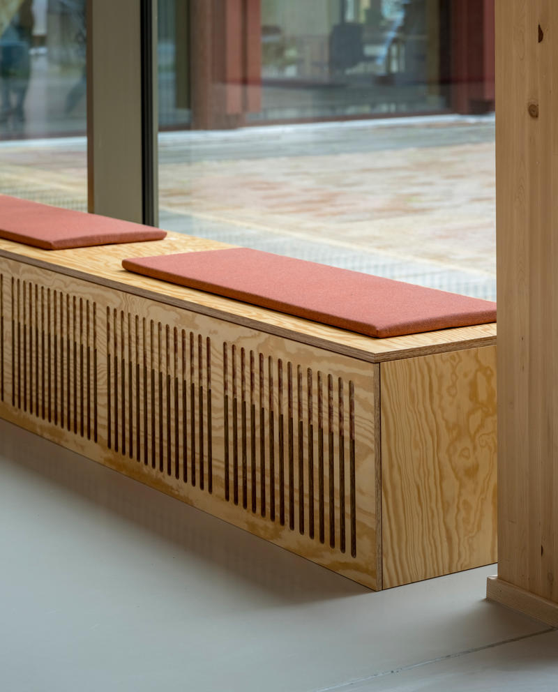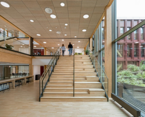 Görünür lamine ahşap kolonlar ve kısmen açıkta bırakılan çapraz lamine ahşap (CLT) döşemeler, yapının ana taşıyıcı elemanlarını oluşturuyor. Bu strüktürel sistem hem yüksek teknik performans sağlıyor hem de mekanda duyusal bir kalite yaratırken karbon depolama işlevi üstleniyor. Cepheler, çevredeki tuğla yapılarla uyum kuran kırmızı-kahverengi tonlarda geri dönüştürülmüş alüminyum panellerle kaplanmış. Cephe derinlikleri güneş hareketine göre çeşitlendirilerek pasif gölgeleme sağlanmış; bu sayede mekanik güneş kırıcı sistemlere ihtiyaç duyulmadan gün ışığından maksimum düzeyde yararlanılmış ve konforlu bir iç mekan iklimi elde edilmiş.
