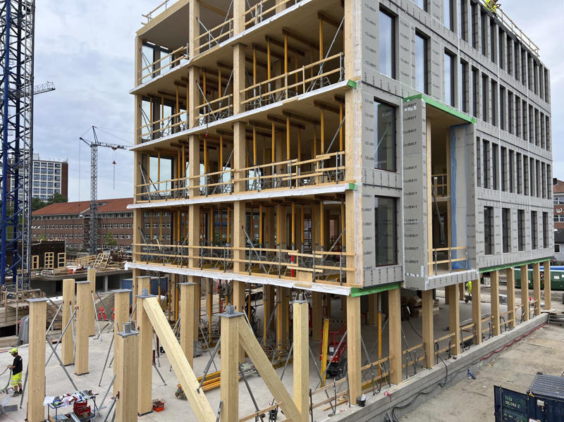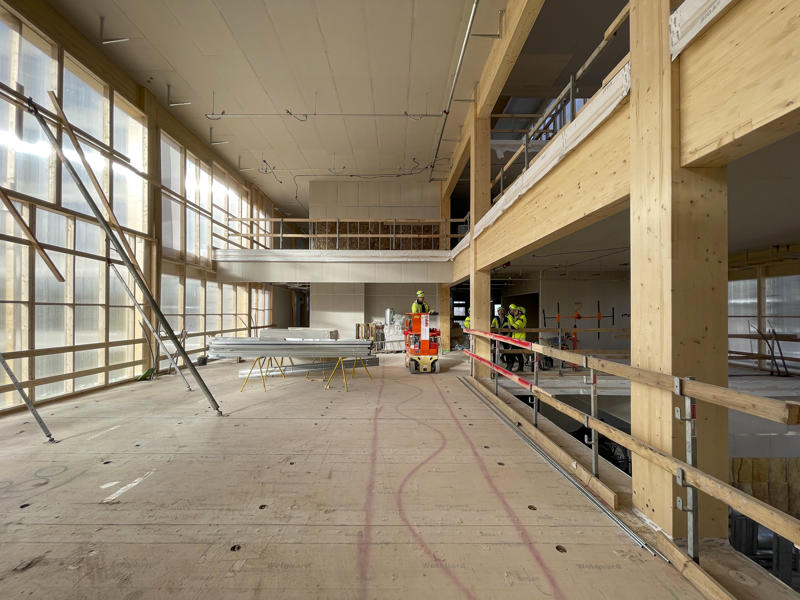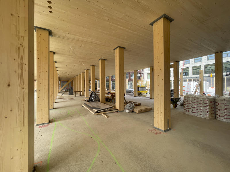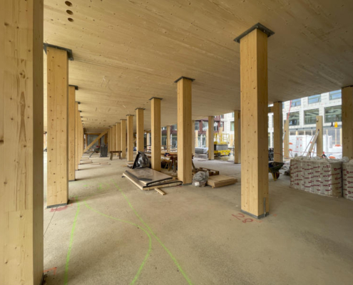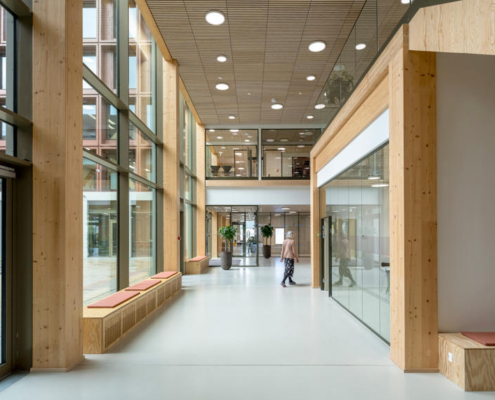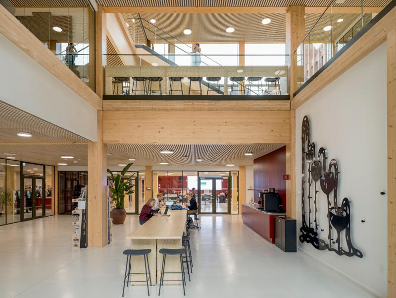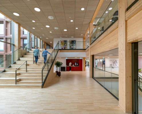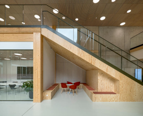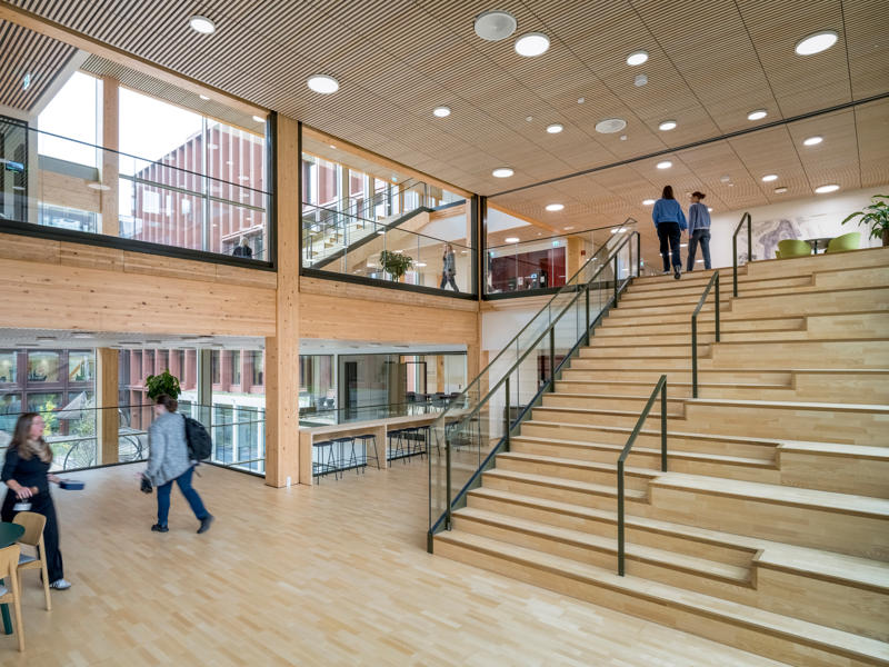 C.F. Møller Architects tarafından tasarlanan WoodHub, masif ahşap taşıyıcı sistemi mimari ifadenin merkezine yerleştirerek, düşük karbon ayak izine sahip büyük ölçekli bir kamu yapısının esnek ve geçirgen bir mekansal karakter ile kentsel bağlamla bütünleşmesine örnek oluşturuyor.