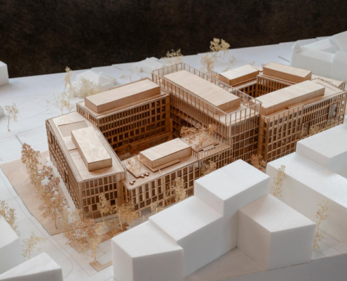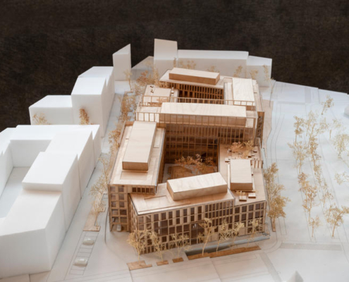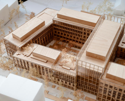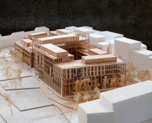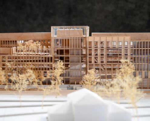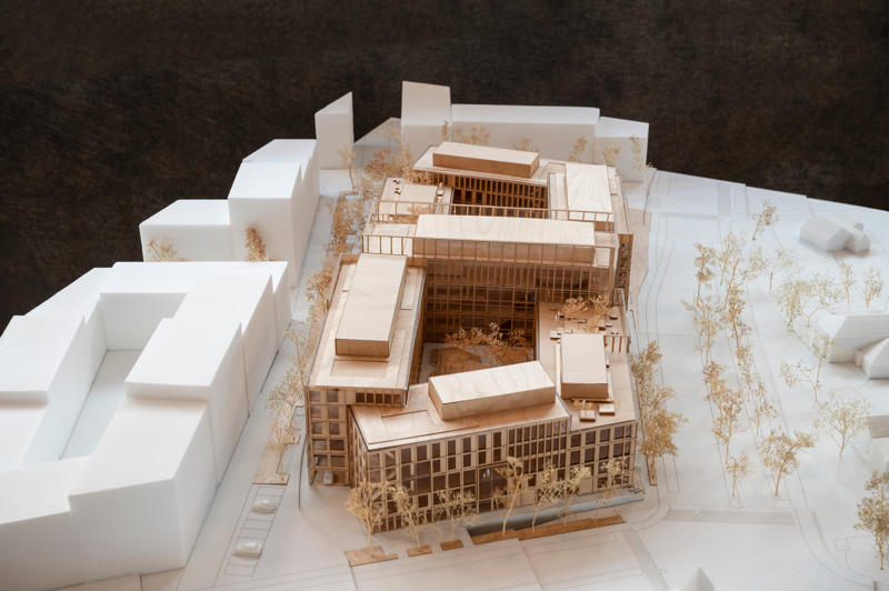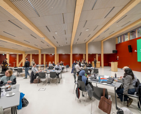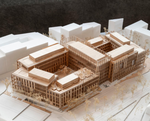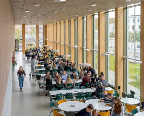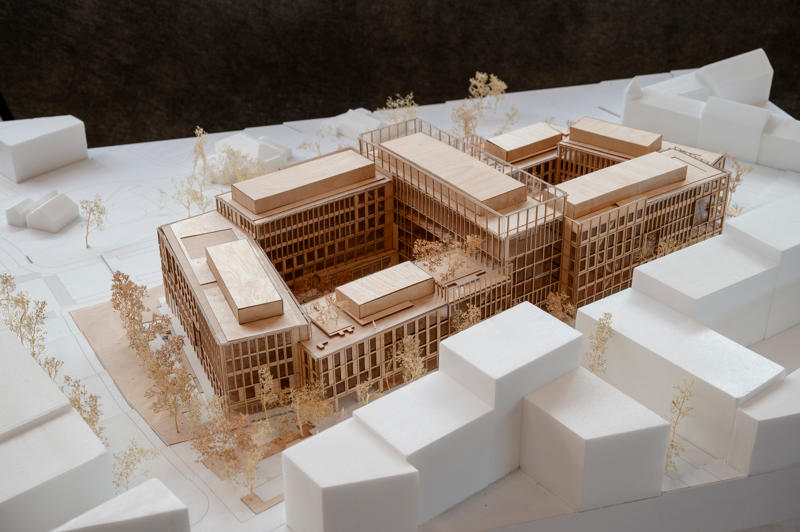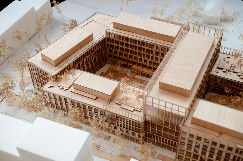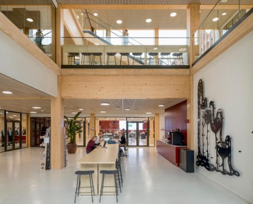 C.F. Møller Architects tarafından tasarlanan WoodHub, masif ahşap taşıyıcı sistemi mimari ifadenin merkezine yerleştirerek, düşük karbon ayak izine sahip büyük ölçekli bir kamu yapısının esnek ve geçirgen bir mekansal karakter ile kentsel bağlamla bütünleşmesine örnek oluşturuyor.