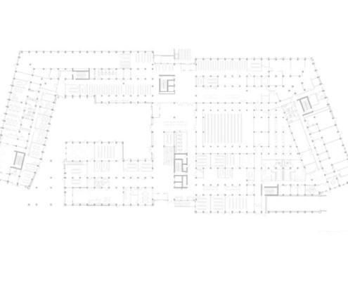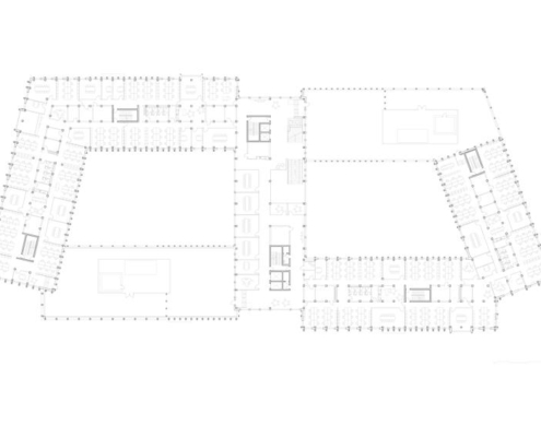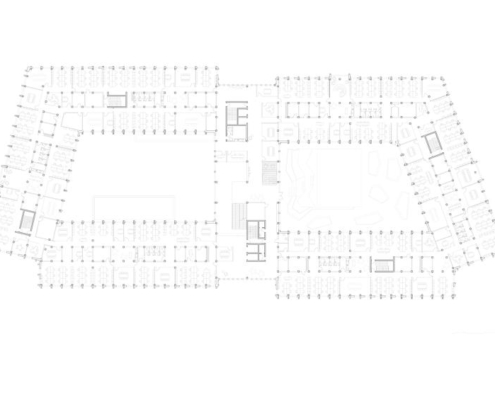 Mekansal organizasyon, ofis alanları ile sosyal buluşma mekanları arasında dengeli ve uyarlanabilir bir çerçeve oluşturuyor. İç mekanlar ihtiyaçlara göre yeniden düzenlenebilecek şekilde tasarlanarak uzun vadeli esneklik hedeflenmiş. Doğu ve batıya yönlenen, üç ila altı kat arasında değişen iki kademeli C planlı ofis kanadı, yedi katlı merkezi bir kanatla birleşiyor. Bu merkezi kanatta ağırlıklı olarak toplantı alanları yer alıyor ve bilgi paylaşımı ile iş birliğini teşvik edecek biçimde kurgulanıyor.