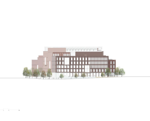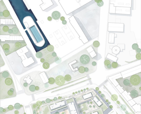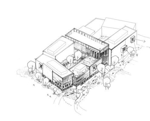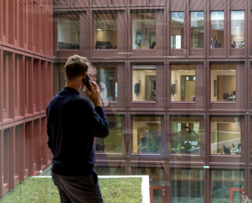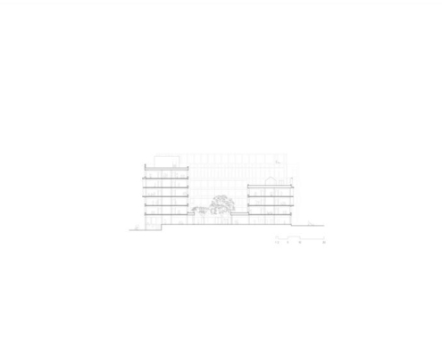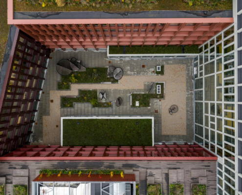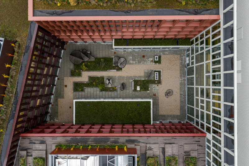 Zemin katta yer alan toplantı merkezi, yemekhane ve kamusal ön büro işlevleri yapıyı kentle ilişkilendiriyor; kentsel yaşam ile iç avlu bahçesi arasında doğrudan bir bağ kuruluyor. Dış cephe boyunca konumlanan nişler ve rekreasyon alanları, çalışma ortamı ile kamusal alan arasındaki etkileşimi güçlendiriyor. Yapı, merkezinde en yüksek kotuna ulaşırken çevredeki yapılarla uyum sağlamak amacıyla kademeli olarak alçalıyor. Çatı terasları, yükseltilmiş avlu bahçeleri ve yeşil iç avlular, çalışma mekanlarını açık alanlara taşıyarak hem molalar hem de açık hava toplantıları için alanlar sunuyor. Bu peyzaj kurgusu aynı zamanda yerel biyolojik çeşitliliği destekleyen bir ekosistem oluşturuyor.