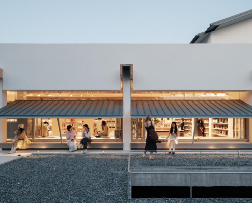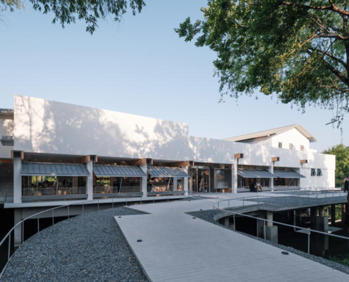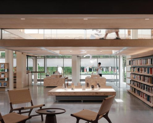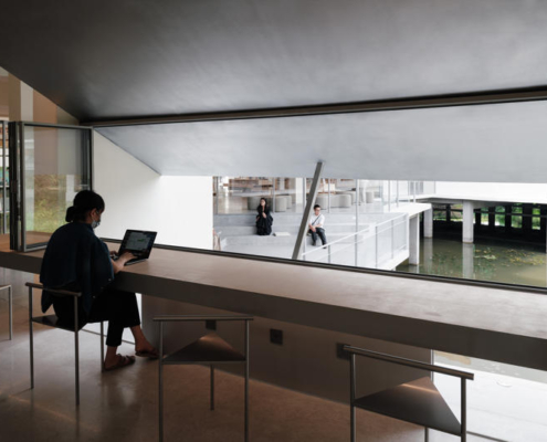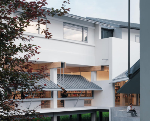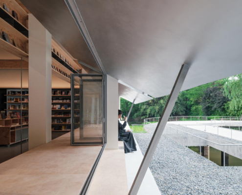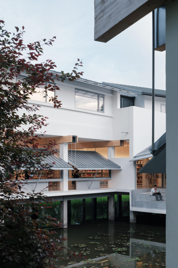 Atelier Wen’Arch, Xixi Goldmye Kitabevi projesinde Hangzhou’daki eski bir ofis yapısını doğa ile bütünleşen ve suya açılan mekan kurgusuyla üç boyutlu okuma deneyimi sunan kamusal bir kitabevine dönüştürüyor.