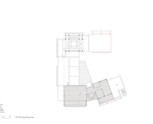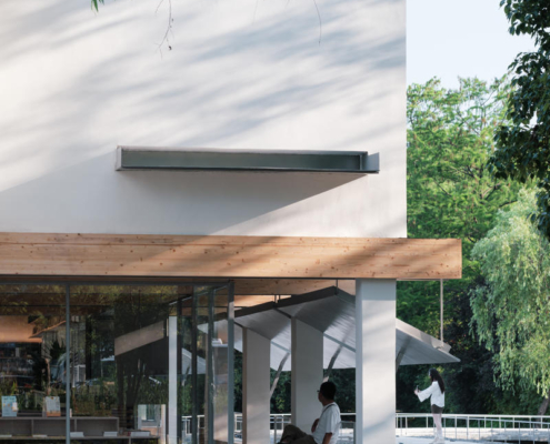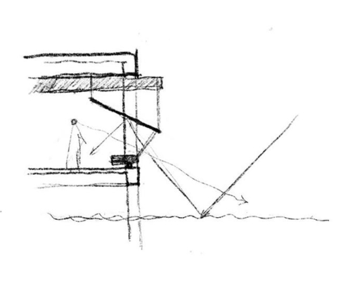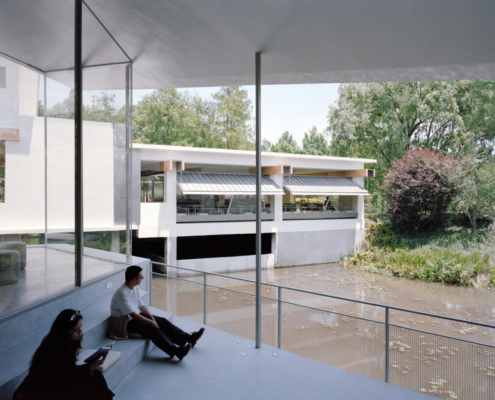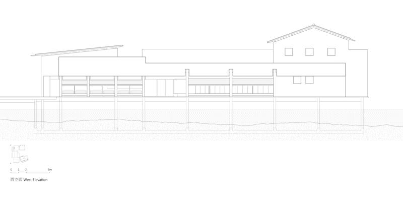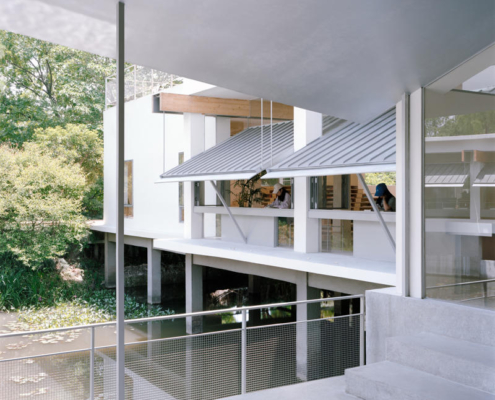 Su avlusuna bakan düzensiz cam hacim, tek eğimli çatıyla değiştirilmiş. Kat planının diyagonal hattından doğan geometrik güç, kademeli olarak alçalan eğimli bir çatı oluşturarak kullanılmış. Aynı zamanda orijinal döşeme kısmı alınarak suya yakın bir gömülü alan yaratılmış. Alçaltılmış çatı ve gömülü zemin birlikte, sulak alanla bütünleşen bir “su kenarı pavyonu” oluşturuyor. Su kenarı pavyonun çatısı gri titanyum-çinko panellerle kaplanırken tavan gümüş metalik boya ile tekdüze olarak kaplanmış. Bu tasarım, eğimli çatının suya bastıran mekansal gücünü vurgularken gümüş malzemenin çevresel ışık yansımalarına verdiği ince tepkiyi de öne çıkarıyor.