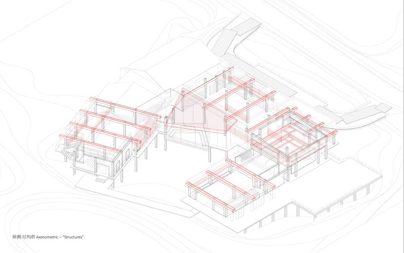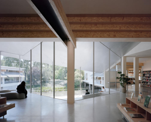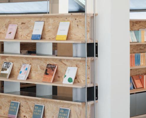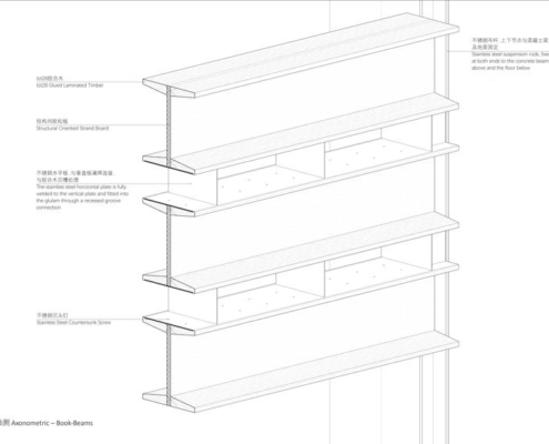 Kitap rafları, kolonlar arasına yerleşen özel yapısal elemanlar olarak tasarlanmış; şeffaf kitap kirişleri okuyucuların hem kitapları hem de çevredeki peyzajı görmesini sağlıyor. Yapısal mühendis Zhang Zhun ile iş birliği içinde, kitap kirişlerinin yapısal kurulumu oluşturulmuş. Yatay ahşap kirişler, dikey paslanmaz çelik plakalarla katmanlı olarak birleşip kompozit bir yapı oluşturuyor. Lamine ahşap ve yönlendirilmiş yonga levha, altı metreye kadar taşıyabilen bir yapı sunuyor. Dikey paslanmaz çelik plakalar, ahşap kirişleri entegre bir yapı birimine bağlayarak düzlem içi burulma direnci sağlıyor. Kitap-kirişleri, her iki taraftan yapısal çubuklarla asılıyor ve kolonlara sabitleniyor; böylece bir “kiriş” tipolojisi taşıyıcı davranışı elde ediliyor.