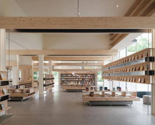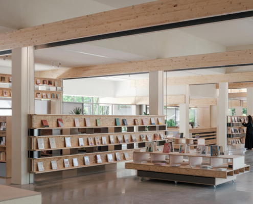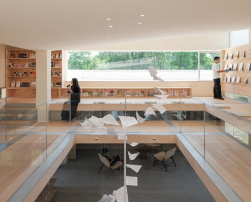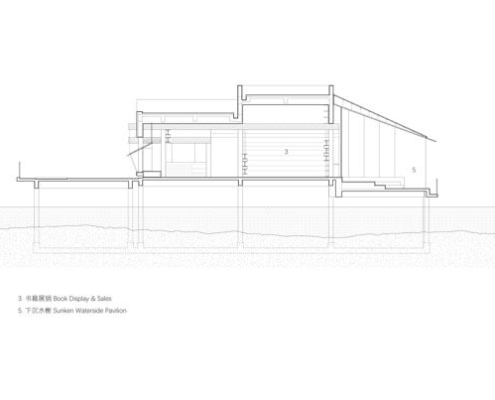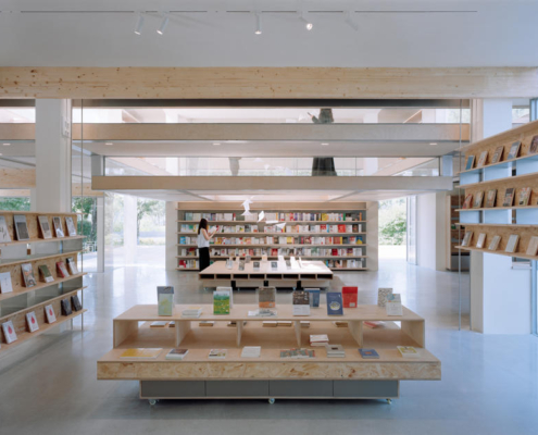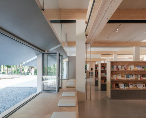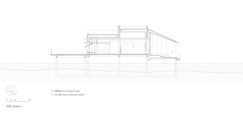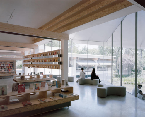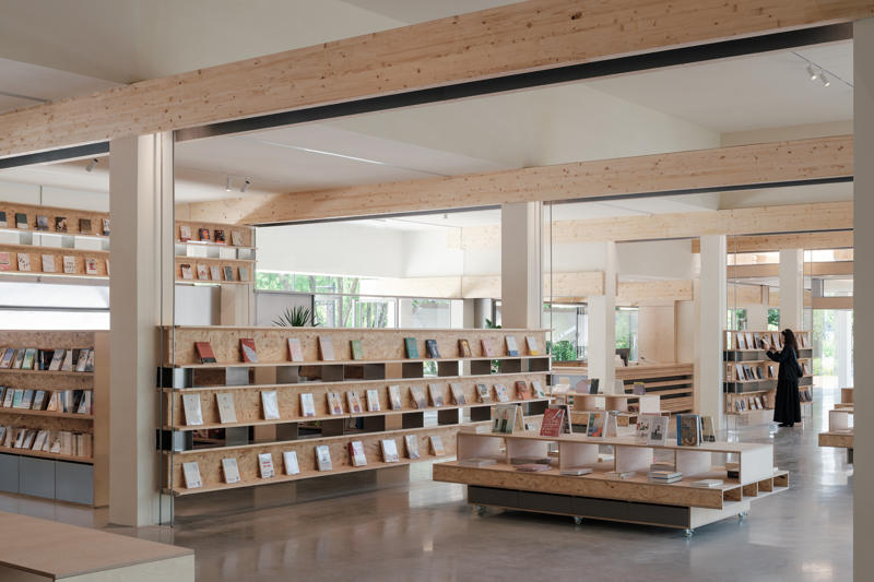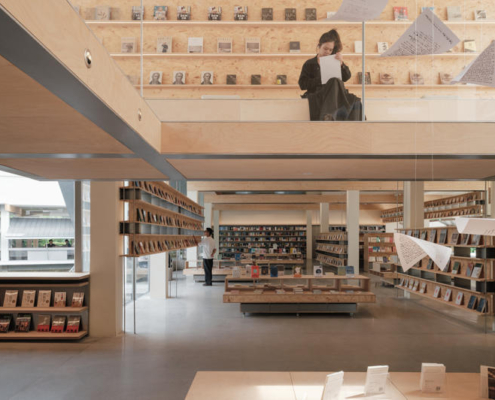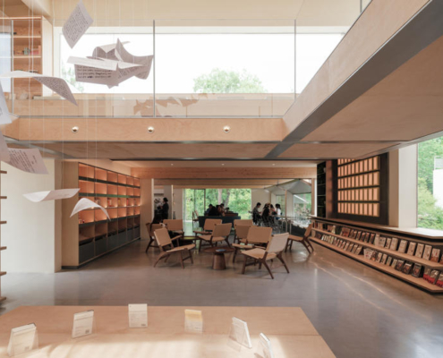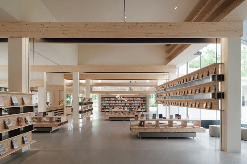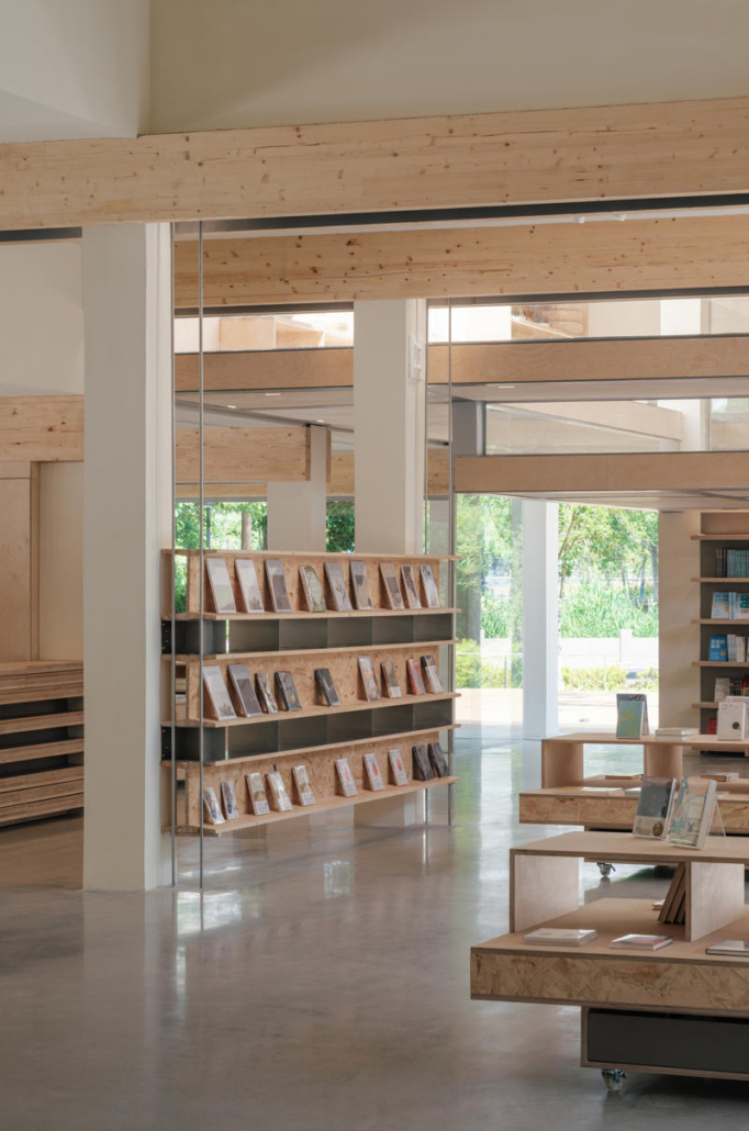 Ahşap kirişlerle oluşturulan yatay mekanlarda, tasarım iki dikey mekansal müdahale sunuyor: Biri gökyüzüne açılan kitap kulesi, diğeri ise sulak alana yönlenen su kenarı pavyonu. Böylece doğal peyzaj, kitabevi mekanıyla üç boyutlu bir şekilde etkileşime giriyor.