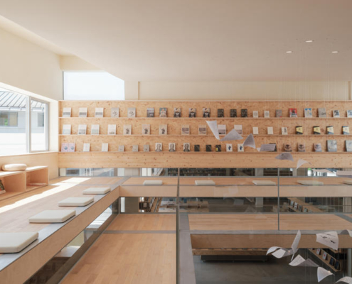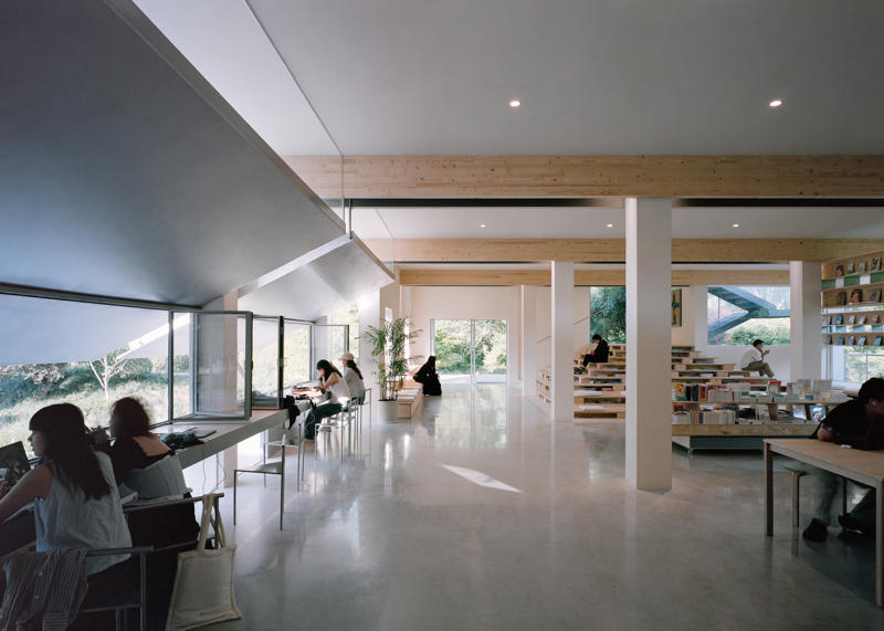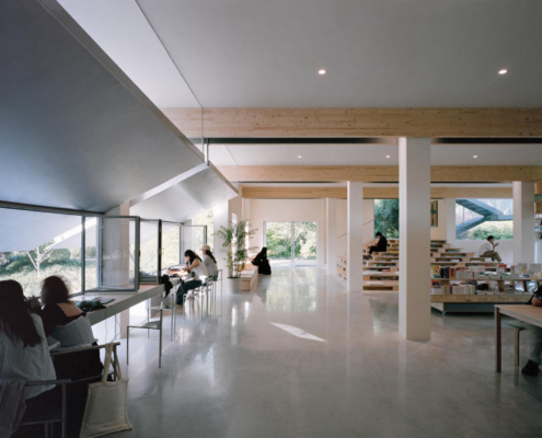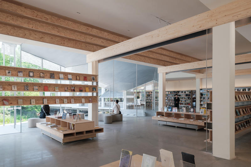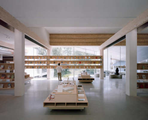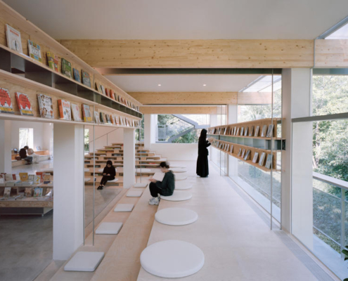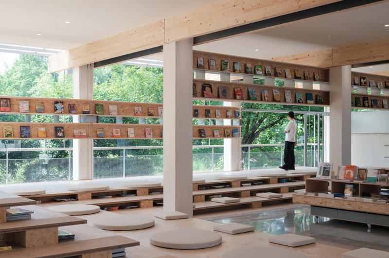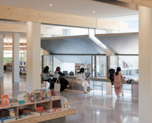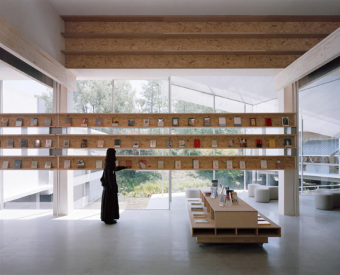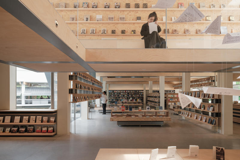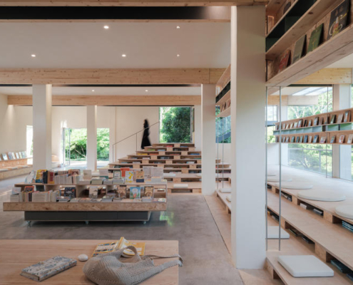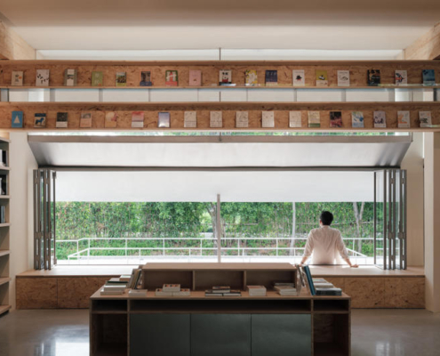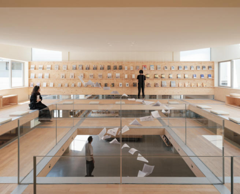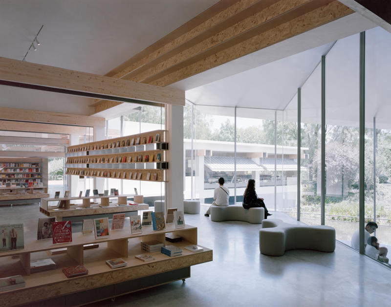 Ahşap kirişlerle oluşturulan yatay mekanlarda, tasarım iki dikey mekansal müdahale sunuyor: Biri gökyüzüne açılan kitap kulesi, diğeri ise sulak alana yönlenen su kenarı pavyonu. Böylece doğal peyzaj, kitabevi mekanıyla üç boyutlu bir şekilde etkileşime giriyor.