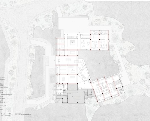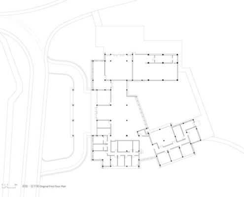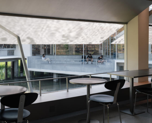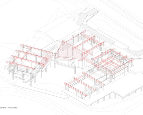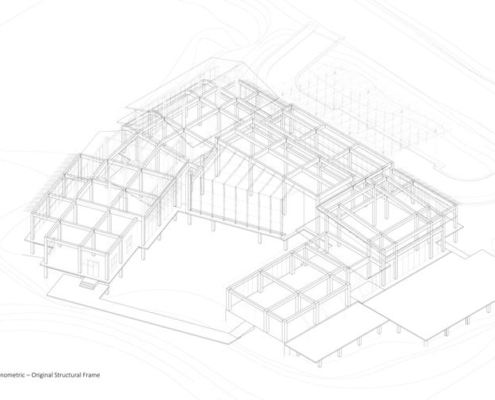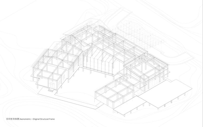 Tüm çevre duvarları kaldırıldığında geriye düzensiz ve anlamsız beton çerçeve yapılar kalmış. Yeni yapı müdahaleleri, başlangıçtaki kaotik yapıya yeni bir düzen getirerek doğayla derin bağ kuran mekansal alanlar oluşturmuş. Orijinal karmaşık çatı kirişleri ve döşemelerine yanıt olarak MEP ekipmanlarını barındıracak bir tavan sistemi eklenmiş. Orijinal çerçeve, birbirine destek veren dikey kolonlar ormanı haline dönüştürülmüş ve çarpık hacimleri taşıması sağlanmış. Batı tarafındaki çatı hacminin basitleştirilmiş düzenlemesi ve cephedeki geri çekilmiş kolonad, binanın kamusal algısını güçlendiriyor.