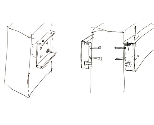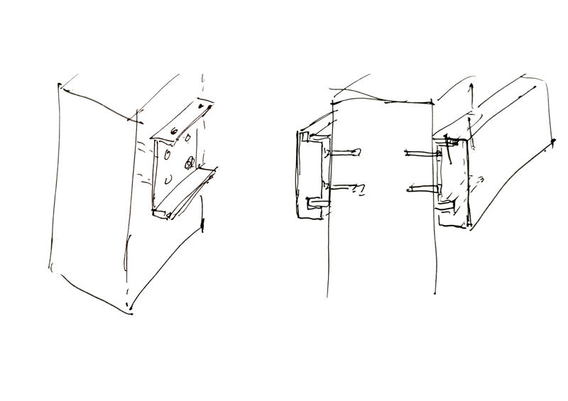 Orijinal yapısal ızgaraya yanıt olarak ahşap çift kiriş sistemi geliştirilmiş. Her çift kiriş, beton kolon sıralarını sürekli olarak kavrayarak su avlusuna dik bir yatay mekansal düzen kurmuş. Yapısal olarak lamine çam kirişler, gizli plaka bağlantılarıyla beton kolonlara sabitlenirken, bazı noktalardan dışa doğru konsol olarak uzanıyor. Çift kirişler arasındaki boşluklar, havalandırma dönüş kanalları ve kolon hizalı aydınlatma için entegre biçimde kullanılıyor.