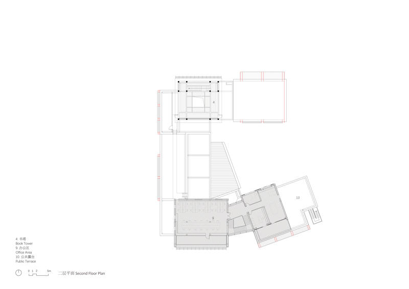 Güneybatı köşedeki yüksek hacme bir “kitap kulesi” yerleştirilmiş. Basamaklı seviyeler farklı yüksekliklerde oturma ve okuma alanları yaratırken doğuya bakan pencere sulak alandan uzak yeşil manzaraları çerçeveliyor. Kitap kulesindeki ara kat, geleneksel döşeme yaklaşımını kırıyor. Çapraz düzenlenmiş çelik kirişlerden oluşan bir ızgara, beton kolonlar arasında asılarak ara kat yapısını oluşturuyor. Kirişlerin üst yüzeyleri ahşap döşeme ile aynı hizada olup kirişlerle aynı malzeme kalitesini görsel olarak paylaşıyor. Kitap kulesinde, yatay ahşap kirişler insan silüetlerini yakalıyor ve bu silüetler mekanda adeta yüzen bir manzara oluşturuyor.