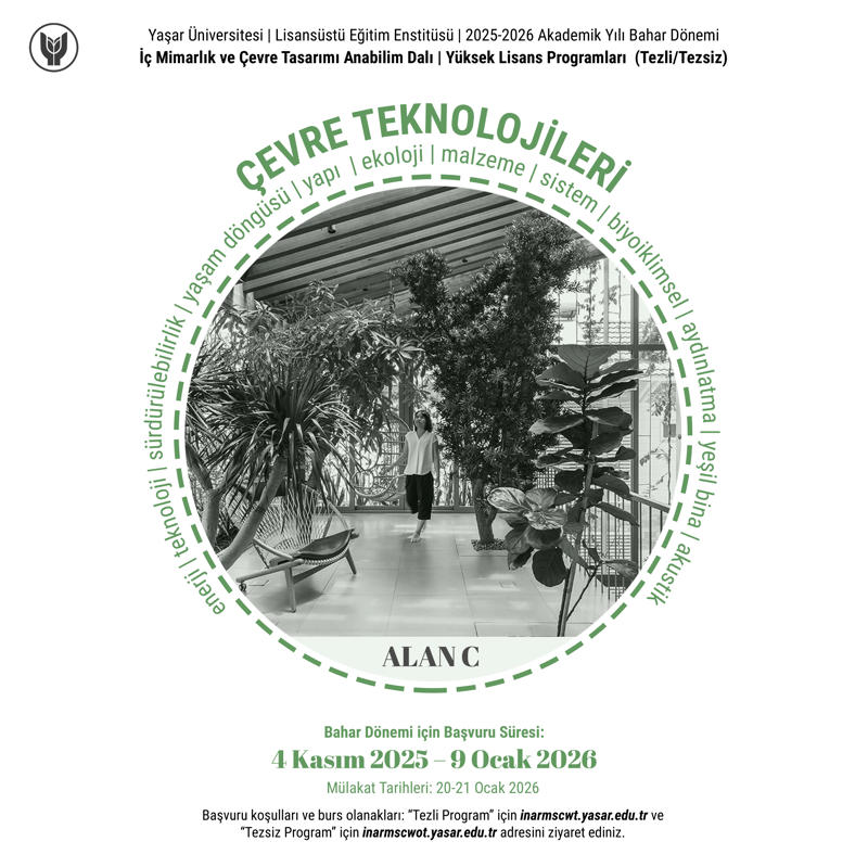 Yaşar Üniversitesi İç Mimarlık ve Çevre Tasarımı Anabilim Dalı Yüksek Lisans Programları (Tezli / Tezsiz), 2025–2026 Akademik Yılı Bahar Dönemi için başvuru sürecini başlattı. Başvurular 4 Kasım 2025 tarihinde başlayacak ve 9 Ocak 2026 tarihine kadar devam edecek.