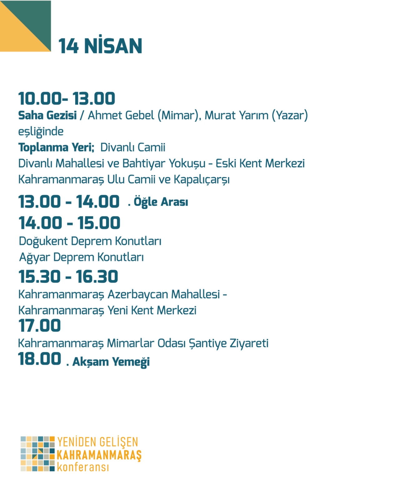 14-16 Nisan tarihlerinde Kahramanmaraş Onikişubat Belediyesi EXPO Alanı’nda gerçekleşecek olan “Yeniden Gelişen Kahramanmaraş” konferansı, “Afet Sonrası Kentsel Planlama ve Yeniden Yapılanma Süreçleri” ekseninde “Çevresel planlama, dirençli topluluklar için dirençli şehirleri yeniden inşa etmenin acil ihtiyaçlarını karşılamak üzere hem fiziksel hem de sosyal boyutlarda dönüştürücü bir araç olarak hareket edebilir mi?” sorusunu referans noktası olarak ele alacak.