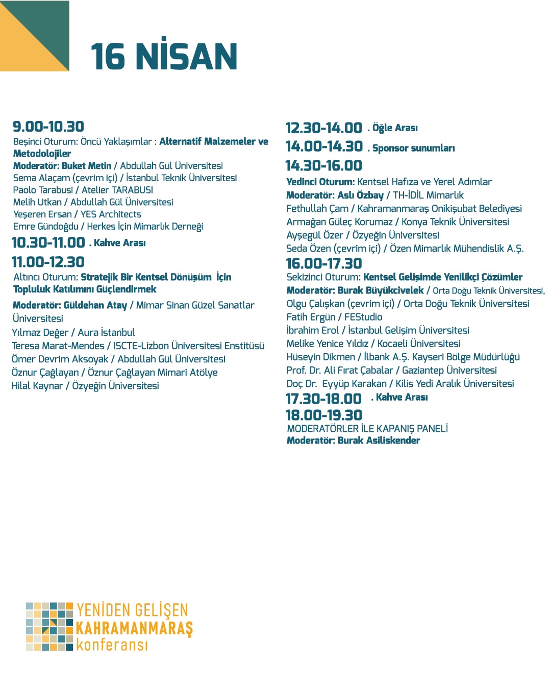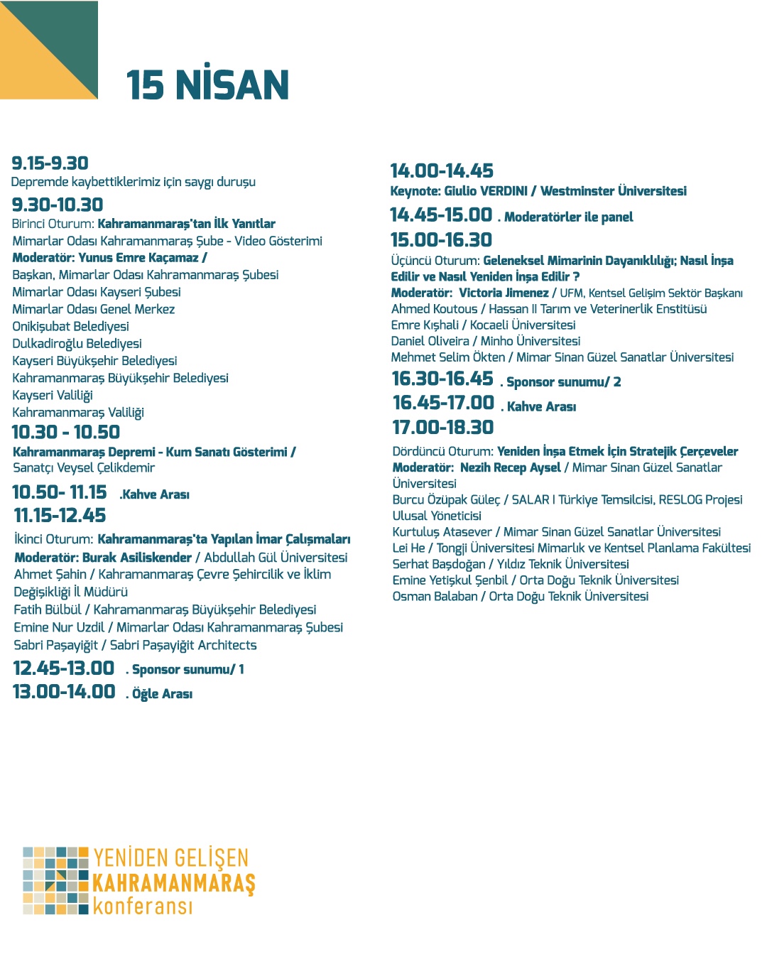 Program, yerel katılımcılarla Kahramanmaraş’ta devam eden yeniden yapılanma süreçlerine odaklanmanın yanı sıra, afetlere yanıt olarak farklı kentlerdeki kentsel tasarım yaklaşımlarına da kapsamlı bir bakış oluşturmayı da hedefliyor. Konferanstaki temalar ve oturumlar, bu bağlamda farklı coğrafyalardaki vaka çalışmalarının ve teorik çerçevelerin disiplinler arası bir yaklaşımla keşfedilmesini sağlamak amacı ile oluşturulmuş.