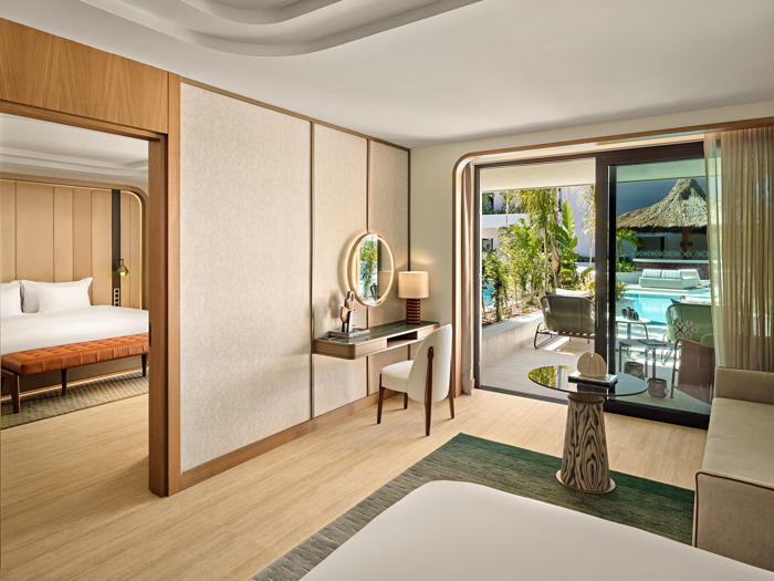 Geçiş alanlarında konumlandırılan enstalasyonlar, ziyaretçiyi bir mekandan diğerine taşıyan sıradan yollar olmaktan çıkıyor; birer keşif sahnesine dönüşüyor. Bu aks, ziyaretçiyi adım adım otelin en mahrem alanlarına, odalarına götürüyor. XO Cape Arnna’daki odalar, mimarinin dinginlik ve ritim arayışının en yalın karşılığı olarak kurgulandı. Her bir odada kullanılan doğal malzemeler, pastel renk paleti ve ışık oyunları, huzurun mimariyle ifadesine dönüşüyor. Konforun yanı sıra, duyuların ritmini sürdüren bu alanlar, misafire kendi iç dünyasına dönme fırsatı sunuyor.