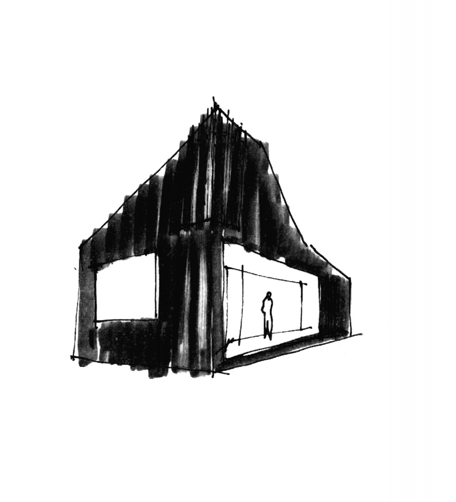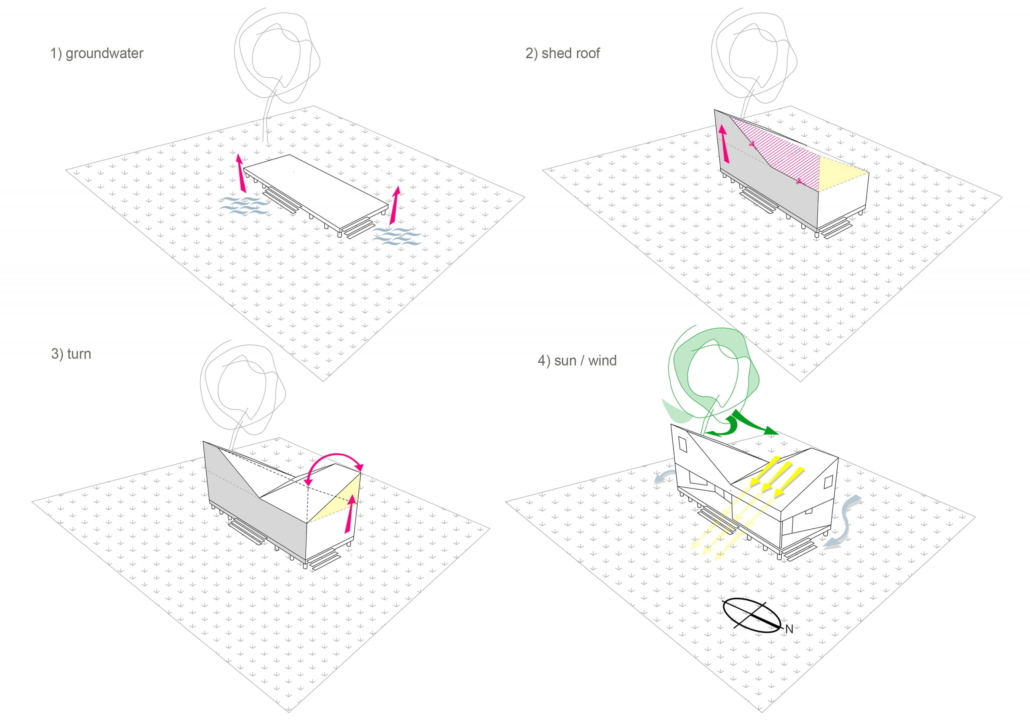Uzun ömürlülüğü artırmak için “yanma ve lekeleme” tekniği kullanılarak işlenmiş karaçamla kaplı ahşap konstrüksiyon evin çarpıcı formu, işverenin evin bir eklem bacaklı gibi görünmesini isteyen 4 yaşındaki oğlundan ilham alınarak tasarlanmış. Bu formun soyutlanması, biri güneydeki mevcut meşe ağacına, diğeri ise kuzeydeki dönerek kırsala yönelen iki kütle oluşturmuş.